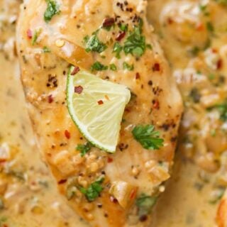 - When the sauce has reduced, remove from the flame, add the butter and whisk until it melts completely. With the skillet off the flame, add the heavy cream, whisk to combine. Place the skillet back over the flame for just 30 seconds, DO NOT allow the sauce to boil. Remove from heat, add the chicken back into the pan and drizzle the sauce over the chicken. Place the skillet in the oven for 5-8 minutes or until the chicken is completely cooked through. Top with chopped cilantro and serve warm with additional lime wedges.
