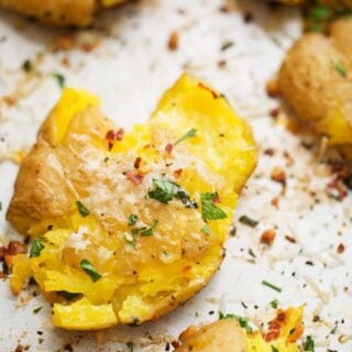 - Drizzle the prepared garlic butter over the potatoes and toss to coat evenly. Using the bottom of a flat-based jar or glass, smash the potatoes until they flatten but remain in one piece. Bake the garlic smashed potatoes for 12-14 minutes then top with the parmesan cheese and continue baking for an additional 5-7 minutes or until the tops are golden and crispy. Serve topped with the remaining parsley.