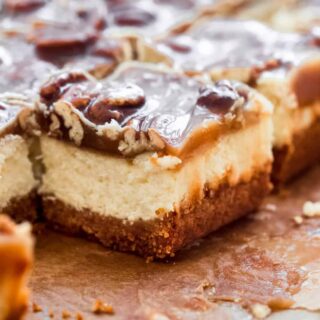 Pecan pie cheesecake bars are made with a graham cracker crust. Then, we top it with a smooth cream cheese filling. And finally, the top layer is a pecan pie caramel topping! These bars are DIVINE!