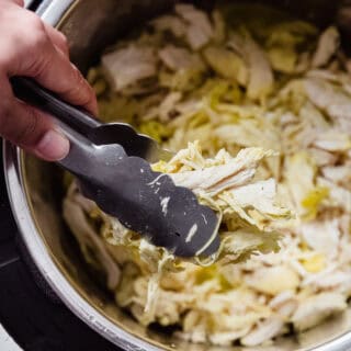 - Prep the chicken. Once you’ve shredded the chicken, I like to let it hang out in the cooking liquif for 5 minutes. This allows the chicken to soak up more of that delicious flavor! Then, remove the chicken using a pair of tongs, so that most of the liquid drips back into the instant pot. And lay the shredded chicken out onto a baking sheet in a single layer. We’re going to use the same technique I’ve used in my chicken carnitas and Vietnamese crispy chicken to make this chicken even more flavorful!