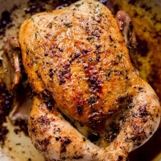 This is the perfect one hour whole roasted chicken recipe. Basted with butter and sprinkled with herbs. The skin is perfectly crisp, and the chicken is juicy and tender! This homemade roasted chicken recipe is better than any rotisserie chicken you can buy at the store!