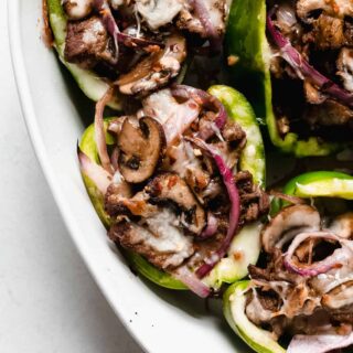 Stuffing veggies full of protein is sort of my jam. When I’m on a low carb kick (which let’s be honest is all the time,) I’ll stuff shrimp into portobellos mushrooms, or even Mexican stuffed avocados, and now, these Philly Cheesesteak stuffed peppers.
