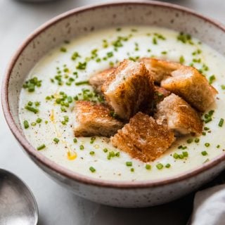 This velvety smooth roasted garlic potato soup has got me falling head over heels with every bite I take. Warm and creamy bites of potato soup with hints of roasted garlic, sauteed leeks, and onions, topped with gruyere grilled cheese croutons. It’s so smooth that it feels like you’re sippin’ on silk! The ultimate comfort food!