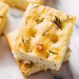 Like traditional focaccia, today’s rosemary focaccia bread recipe has tons of rosemary in it. Usually, I err on the side of caution when it comes to rosemary because personally, I find it can go from adding earthy flavor to tasting like hand soap rather quickly. Maybe that’s just me. But even though we’re using a full tablespoon in today’s bread dough and then topping it with more rosemary, I have yet to make a batch that teetered on the verge of too much.
