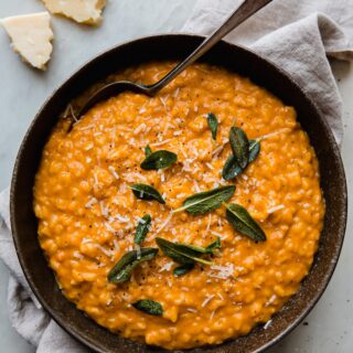 This creamy, hearty squash risotto is perfect for fall! Roast honeynut or butternut squash with a sprinkle of cayenne and a drizzle of maple syrup. Then we’ll saute it with arborio rice to make squash risotto. Finish with a knob of butter and shredded cheese for buttery perfection!