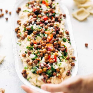 So you resort to store-bought apps. You know what’s a little more elevated than bringing a couple tubs of hummus to the party? Redirecting that hummus home, layering it into a seven-layer chickpea shawarma dip with roasted chickpeas, then popping it all on a fancy dish. That’s right. And you know what? I’m not going to tell everyone this is semi-homemade if you won’t. Be proud of your simple shawarma dip making ways. And just know that it’s not really a recipe because we’re grabbing a handful of ingredients and layering it all in a dish. And well, if that counts as putting in a ton of effort, so be it. Who are we to even challenge that?