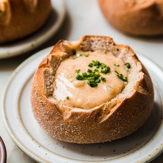 This smoked gouda soup is the ultimate comfort food! We’ll saute some aromatics until fragrant, create a bechamel and then add in tons of shredded smoked gouda cheese and smoked paprika. I serve this in a bread bowl but this would be equally delicious with sourdough croutons.