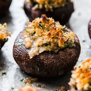 And not that you’ll have the entire town in your living room, but if you made these for a party, they would definitely be the most memorable part. This recipe is inspired by creamed spinach meets my 3 ingredient spinach dip. Because texturally, they’re actually perfect. Soft mushroom caps, creamy filling, and crunchy topping. What is there not to love?