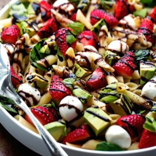 An easy strawberry caprese pasta salad that makes a perfect side or a main course! This pasta salad is tossed with a light homemade balsamic glaze and is perfect for spring or summer picnics! Serve it my itself or add in leftover diced chicken!