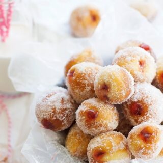 They’re soft pillowy bubbles of airy, doughy goodness that are rolled around in sugar and then filled, and I do mean filled, with strawberry jelly. It’s the perfect kind of doughnut hole that’s made to be consumed by the dozens with lots of hot coffee.