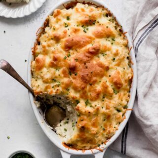 A better way to eat a baked potato! This twice baked potato casserole, also known as, potatoes Romanoff starts with baked potatoes that are shredded and folded with tons of cheddar cheese, shallots, seasonings, and sour cream. So good you’ll want to make this all the time!