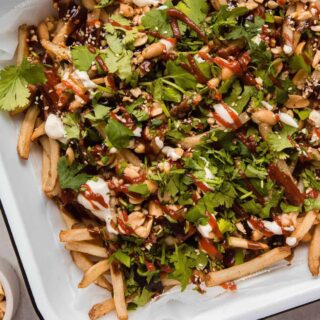 These Vietnamese-inspired street fries are a party for your mouth! We start with a bed of crispy, crunchy oven-baked fries, topped with, count ‘em – 3 different sauces. There’s chopped peanuts, a squeeze of fresh lime juice, toasted sesame seeds, and fresh, punchy cilantro to lighten and brighten the whole thing. It’s herby, it’s fresh, it’s flavorful, and it’s perfect for serving on a hot day, poolside with an ice-cold drink (I’ve been obsessed with homemade frozen mint lemonade, and it would work soo well with these!)
