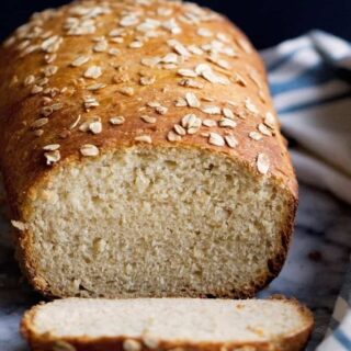 This is the easiest bread to make. That’s especially true if you’re a beginner at yeast breads. Trust me, you have to try this. Homemade honey oatmeal bread with honey and sprinkled oats on top. The texture is fluffy and chewy, yet sturdy enough for a sandwich. The crust, browned to perfection hearty and crunchy around the edges. Trust me, you won’t be removing the crust on this bread. Everything about this bread is perfect. Sweetened with honey.