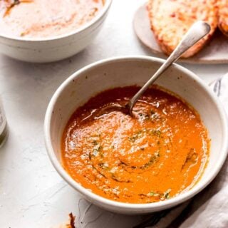 Ok let me start by saying I LOVE THIS RECIPE! However, I don’t eat it as a soup. I cut the chicken stock in half and eat it over pasta! I love the roasted flavor of this sauce/soup.