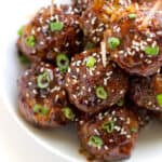 Using 2 tablespoons, dip each individual meatball into the sauce. Alternately, you can brush each meatball with the sauce. Place back on the baking sheet and bake for an additional 2 minutes. Sprinkle with additional scallions and sesame seeds. Serve warm.