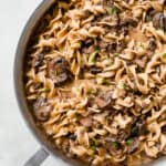 One-pot 30-minute skillet ground beef stroganoff! This recipe is perfect for weeknight dinners because cleanup is a breeze, and it all comes together fairly quickly! Happy tummies all around!