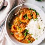 FINISH: Add the shrimp, give it a stir and allow to continue to simmer for an additional 3-5 minutes or until the shrimp are opaque and cooked through. Turn off the heat, throw in the knob of butter and stir so it melts into the étouffée. Remove the bay leaves, serve warm over rice topped with green onions!