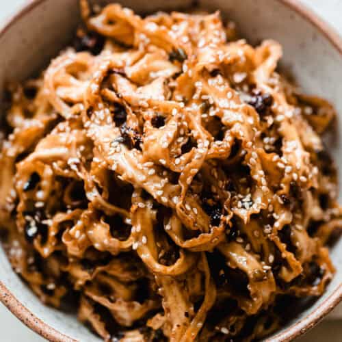 TOSS: Drain the noodles, but do not rinse them. Add them to the sauté pan and toss in the prepared sauce for one minute over medium low heat. Taste and adjust with kosher salt or soy as desired.
