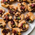 Cranberry Brie Bites are a super easy homemade appetizer. Made with puff pastry sheets, brie, leftover whole cranberry sauce, walnuts, and a sprig of rosemary! Baked until golden and bubbly!