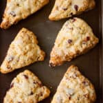 Flour your work surface and your hands before removing the dough from the mixing bowl. Work the dough into a neat 10 inch circle. Cut into 8 equal pieces using a sharp knife or a dough scraper. Place the scones 1 ½ - 2 inches apart on the baking sheet. Brush with the remaining 2 tablespoons of heavy cream and sprinkle with sparkling sugar if desired.
