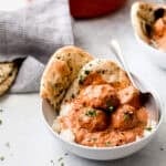 CHIPOTLE BUTTER SAUCE: While the meatballs are baking, heat the butter in a dutch oven or sauté pan. Add the onions along with a tiny pinch of salt and let them cook until they soften, about 7-8 minutes. Add the garlic paste and give it 30 seconds to allow the garlic to become fragrant. Stir in the tomato puree, chipotle peppers, adobo sauce, all the seasonings, and ½ cup water. Allow the sauce to gain a simmer, reduce the heat to low and let simmer for 10 minutes. Stir in ¾ cup heavy cream and butter. Add the meatballs and allow them to sit in the sauce for a couple minutes before serving. Taste and adjust with additional heavy cream as desired. Serve warm over warm