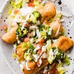 FRY: preheat 1 cup of oil in a medium frying pan over medium-low heat until it reaches 350ºF. You don’t want to deep fry, so just enough oil to come ½ way up the frying pan. Once heated, slowly lower 4-6 taquitos in the oil at a time and allow them to fry for 2-3 minutes per side. Remove to a baking tray lined with a cooling rack and allow them to rest while you fry the rest.