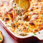 bake: Spray a cast iron skillet or a 9x9 baking dish with nonstick cooking spray; add the prepared dip. Flatten out the dip and top with the remaining shredded cheese. Place the dish on a baking sheet to prevent spill over in the oven. Bake the dip for 20-25 minute. You can also pop it under the broiler for the last 1-2 minutes to get the cheese extra bubbly on top! Serve warm with