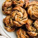 Easy Puff Pastry Twists shaped into buns and topped with sesame seeds! These little swirls are perfect to make ahead as an appetizer for parties! They're loaded with a za'atar herb filling and topped with sesame seeds. Trust me, these are sure to be a hit!