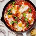 Soft-cooked eggs simmered in a robust tomato sauce flavored with garlic, herbs, and red pepper flakes. This Eggs in Purgatory recipe requires a handful of ingredients and is ideal to serve for breakfast, brunch, lunch, or even dinner!