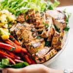 Assemble:Place the chopped lettuce in a large bowl, top with the salsa, grilled peppers, and diced chicken. Serve immediately. You can also make and keep the components separately until ready to serve.
