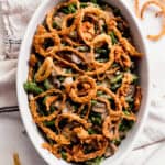 A creamy and comforting green bean casserole made entirely from scratch. Topped with shoe-string onions and the best part is, my green bean casserole doesn’t require oven time!