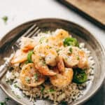 FINISH: If there is no oil left in the skillet, drizzle a teaspoon of oil and allow it to heat. Add the sliced onions and jalapeños to the pan and cook for about 1-2 minutes or until they are fragrant. Add all the shrimp back to the skillet and using a spatula, toss the shrimp around so they are evenly coated with the onions and jalapeños. Sprinkle with a small pinch of salt and black pepper to just season everything. Let cook for another 1-2 minutes before removing from the heat.