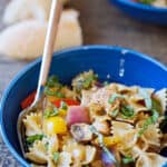 Reduce the heat to medium, add the broth, cream, and pasta to the pot and bring to a boil. Reduce the heat to medium-low, cover and let the pasta cook for 12-14 minutes or until the pasta is tender. Add the chicken and veggies back into the pot. Sprinkle in the parmesan cheese. Stir to combine. Top with basil and serve warm.