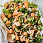 ASSEMBLE: Add the arugula to a platter (if using.) Keep dressing has salad separate if you aren’t serving immediately. In a large bowl, toss the cantaloupe, Persian cucumbers, and pecans together with the dressing. Then add the feta to the bowl. Arrange the tossed fruit over the arugula and serve immediately once dressed. Enjoy!