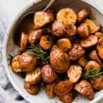Rosemary Roasted Potatoes are an easy, delicious side dish that is perfect to pair with chicken, steak, or a roast! Great to serve on a weeknight and just as delicious for a Christmas dinner!
