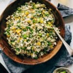 Learn how to make the best street corn rice salad! This is Mexican style street corn (aka elotes) but in salad form! Tossed with a lemon-lime vinaigrette. This salad has tons of roasted corn, chopped scallions, cotija cheese, and of course, diced avocados!