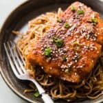 TOSS NOODLES: When there are 2 minutes remaining for the noodles to be done, melt the butter in the same skillet over medium-high heat. Add the garlic, ginger, and white portion of scallions and saute until fragrant, about 45-60 seconds. Season the ginger garlic mixture with the soy sauce, sesame oil, fish sauce, oyster sauce and sugar and stir to combine. Add the prepared noodles, stir to combine, let sit for 1 minute and sizzle in the pan, then toss, and continue to cook and toss for another 2 minutes. This gives the noodles a smoky, toasty flavor.