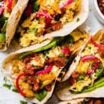 SERVE: Stuff the warm tortillas with the prepared egg mixture. Top with sliced avocados, pickled onions, and drizzle with hot sauce or salsa, and enjoy!